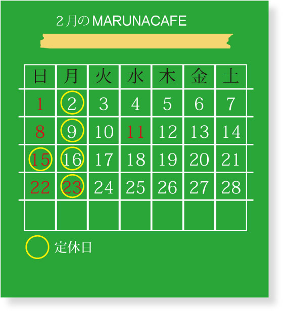 まるなかふぇの今月のスケジュールです2月のスイーツは「胡桃たっぷりブラウニー」です。