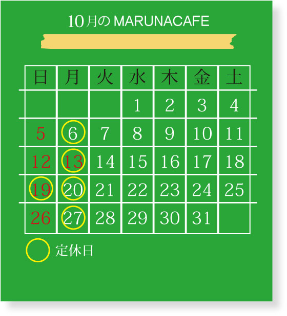 まるなかふぇの今月のスケジュールです10月のスイーツは「チョコタルト」です。