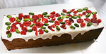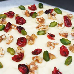 ドライフルーツをたっぷりと入れて焼きあがったケーキにホワイトチョコをかけその上にピスタチオとクランベリーで飾り付けた上品な甘さのフルーツケーキです。