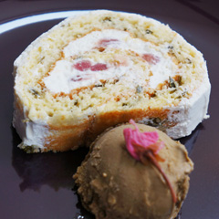 香ばしいキャラメル風味のクリームが入ったマロンロールケーキ。キャラメル風味を消さないで尚且つ自身の風味をはんなりと醸し出しているほうじ茶アイス添えです |
